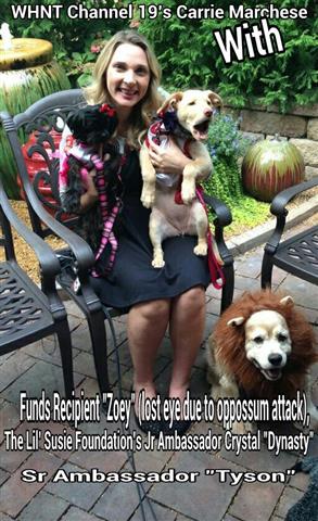 Carrie Marchese poses with a Shih Tzu named "Zoey" a Lil' Susie Foundation Funds Recipient, as well as the Foundation's Jr Ambassador, a Dudley Lab named Crystal "Dynasty" (aka Dy-Nasty: see photo above) and Sr Ambassador, a AKC registered Cocker Spaniel (with Clumber in bloodline) named "Tyson". This photo was taken after the Noon Day taping promoting the upcoming 5K Run/Fun Walk and Pet Parade and Pet Halloween Costume Contest on October 26th, judged by WHNT TV 19's own Beth Jett. Please visit www.lilsusiefund.org or call 256-412-4887 for more information.